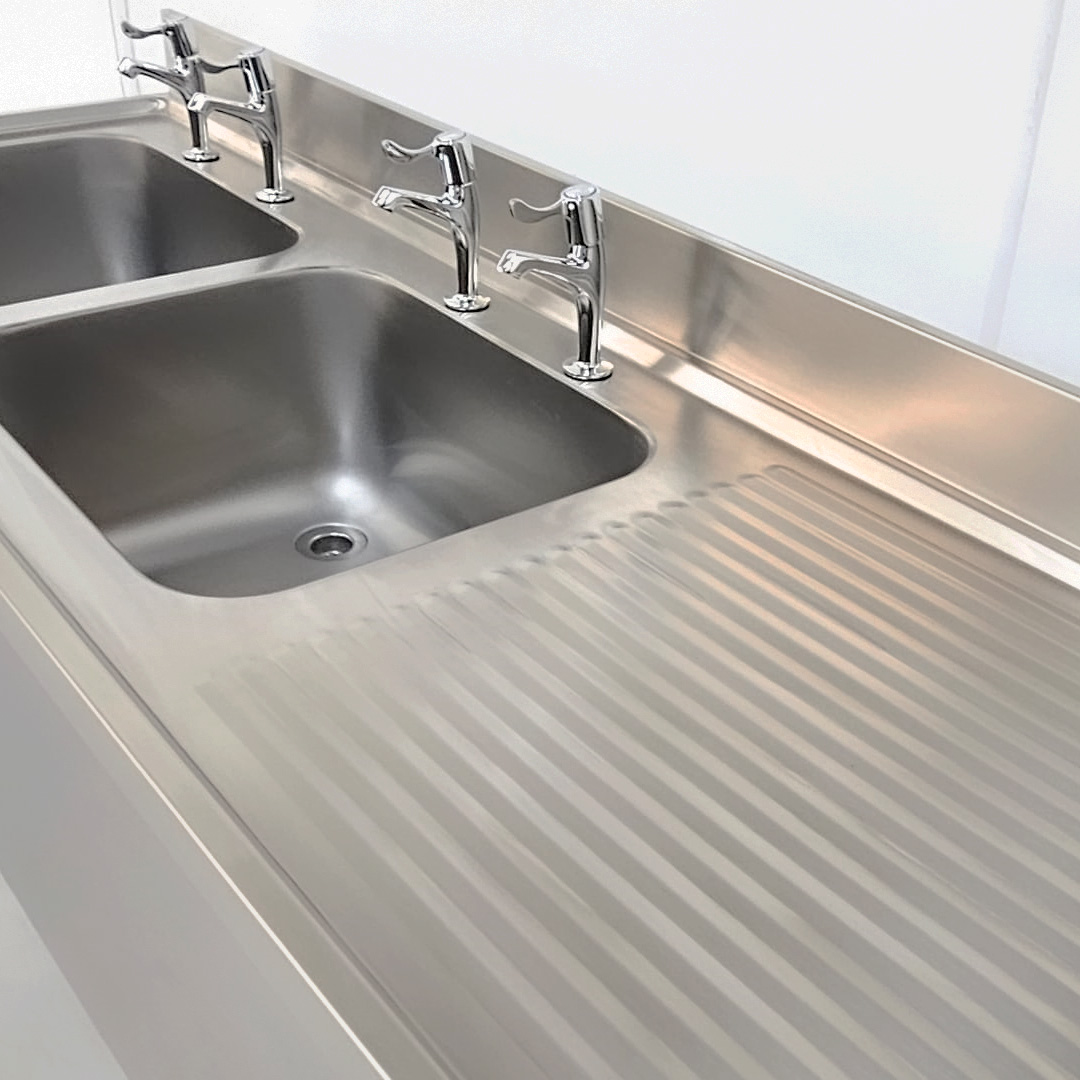 To the Right of the sink, the draining board is slightly sloped to prevent pooling. This allows for fast and efficient drying, while being perfectly placed for easy access. The sink itself has a central plughole for draining,  Below, a robust and sturdy valance to the front and sides hides all the pipe work so it stays looking clean and tidy.