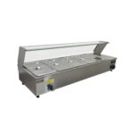 The Heittox wet bain marie is a versatile and reliable unit perfect for any commercial kitchen. With its 5 x 1/3 100mm Gastros, the wet service Bain Marie with glass canopy can hold a variety of pre-cooked foods ready to serve.